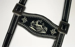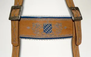 Lederhosenträger natur, mit bayrischem Wappen, Zinn-Nägel teilweise mit blauem Leder unterlegt, Zierstich mit gespaltenen Federkielen, blaue Ledereinfassung, zwei geprägte Silberschnallen