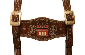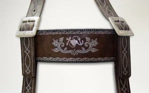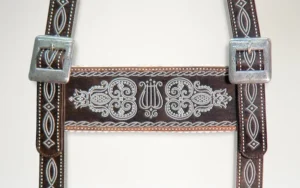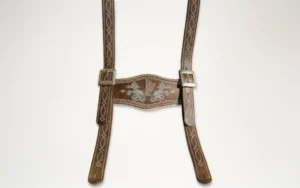 Lederhosenträger antikbraun handgefärbt, mit Zinn-Stiften verziert. Am geschwungenem Blatt Harfenmuster mit Zinn-Nägeln, Zierstich mit gespaltenen Federkielen, zwei geprägte Silberschnallen